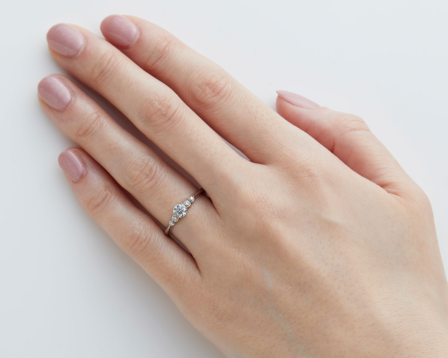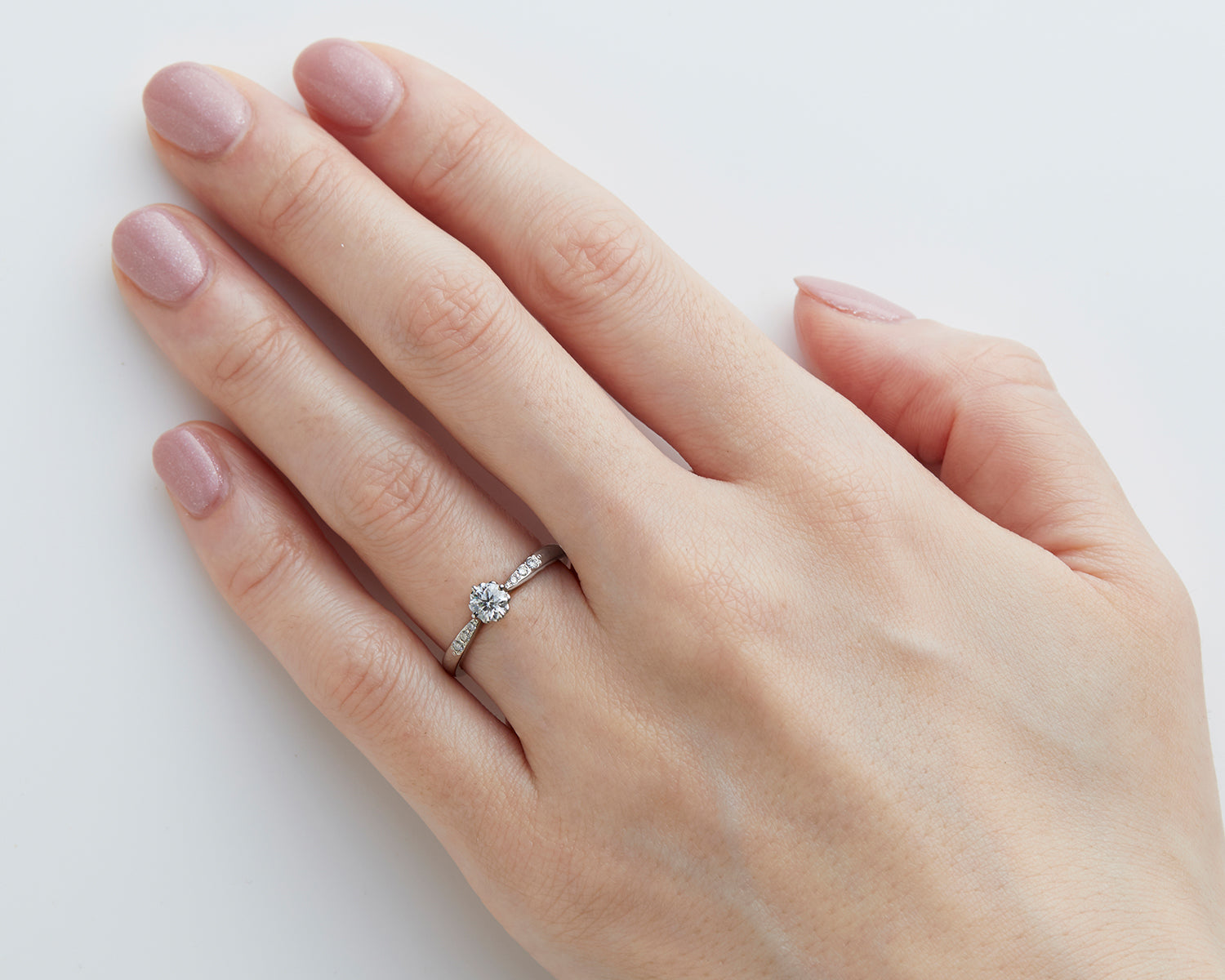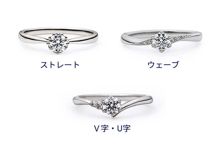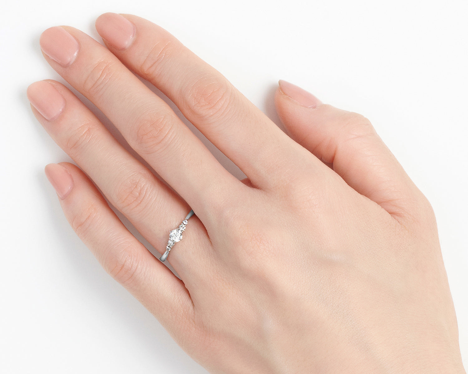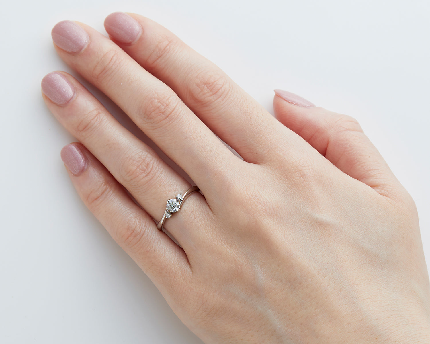 婚約指輪は左手の薬指に着けるのが一般的。デザインは主にウェーブ・ストレート・V字/U字のタイプがあり、結婚指輪と重ねて着用いただけます。お手元の骨格は人それぞれ個性があり、身に着けた時の印象が変わります。実際に試着した時の着け心地や、鏡でさまざまな角度から客観的に見ていただくのがおすすめです。ヴァンドーム青山では、サプライズでお渡しする方にもお相手の好みが必ず見つかる多様なデザインをご用意しています。