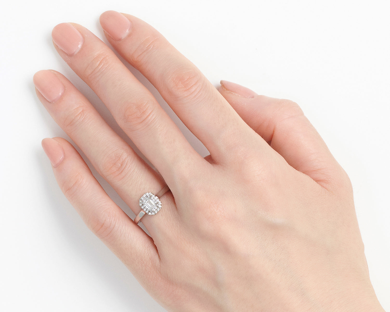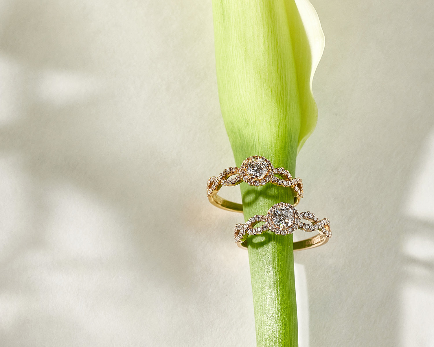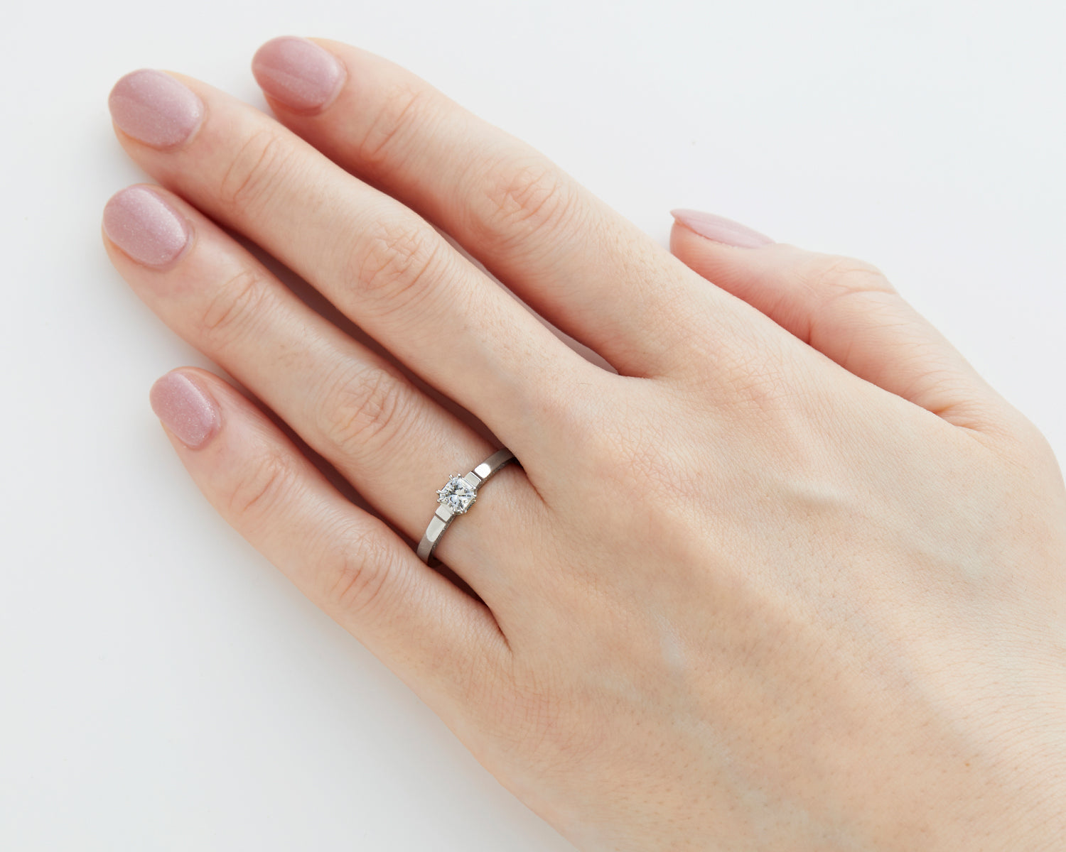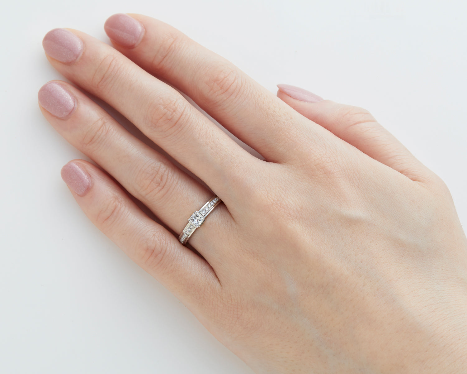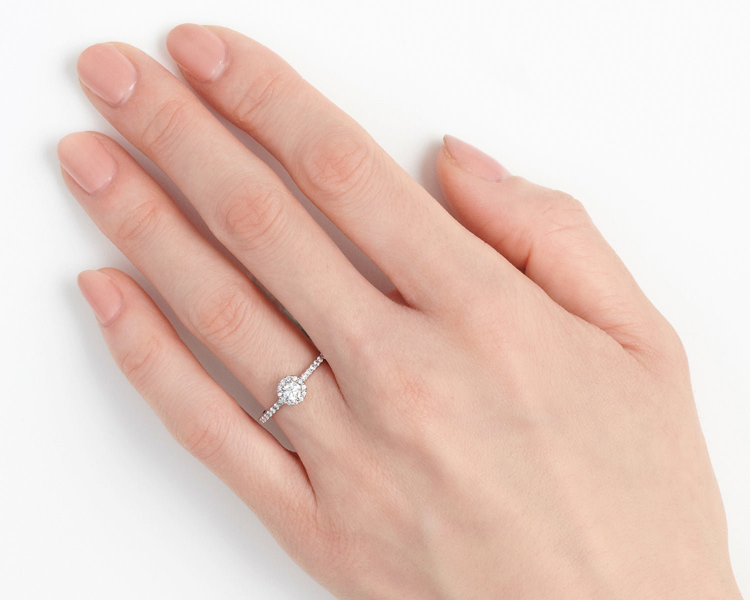 婚約指輪は左手の薬指に着けるのが一般的。デザインは主にウェーブ・ストレート・V字/U字のタイプがあり、結婚指輪と重ねて着用いただけます。お手元の骨格は人それぞれ個性があり、身に着けた時の印象が変わります。実際に試着した時の着け心地や、鏡でさまざまな角度から客観的に見ていただくのがおすすめです。ヴァンドーム青山では、サプライズでお渡しする方にもお相手の好みが必ず見つかる多様なデザインをご用意しています。