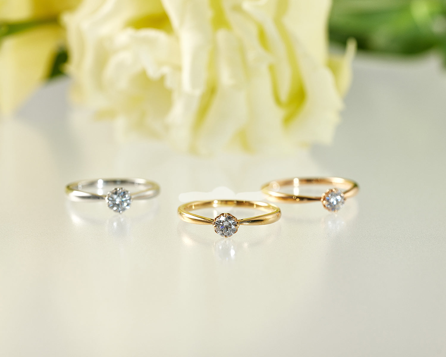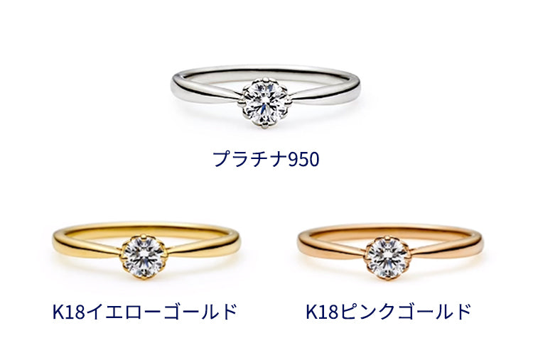 婚約指輪の素材はプラチナが定番ですが、最近ではライフスタイルや好みに合わせてゴールド素材を選ばれる方も増えています。素材それぞれの特徴や肌馴染み、普段の装いなどに合わせ、お手元に一番しっくりくる素材をお選びいただくことをおすすめいたします。ヴァンドーム青山では、耐久性に優れ、長く使用していても変色や変形が起こりにくい王道のプラチナ950の他、 肌馴染みが良く華やかなK18イエローゴールド、K18ピンクゴールドでオーダーいただける婚約指輪もございます。