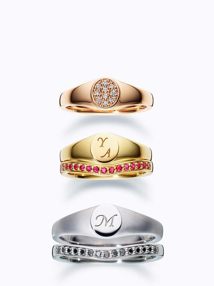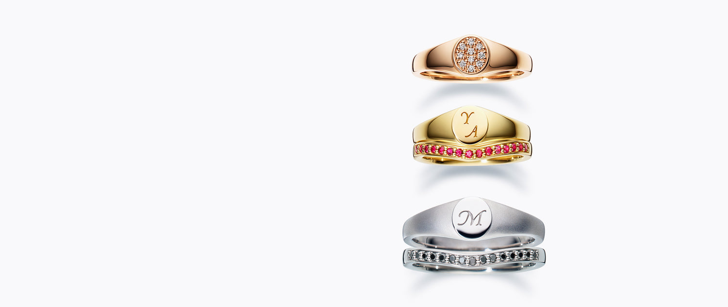 地金素材や仕上げ・イニシャル・アニバーサリーストーン(誕生石)などを組み合わせ、