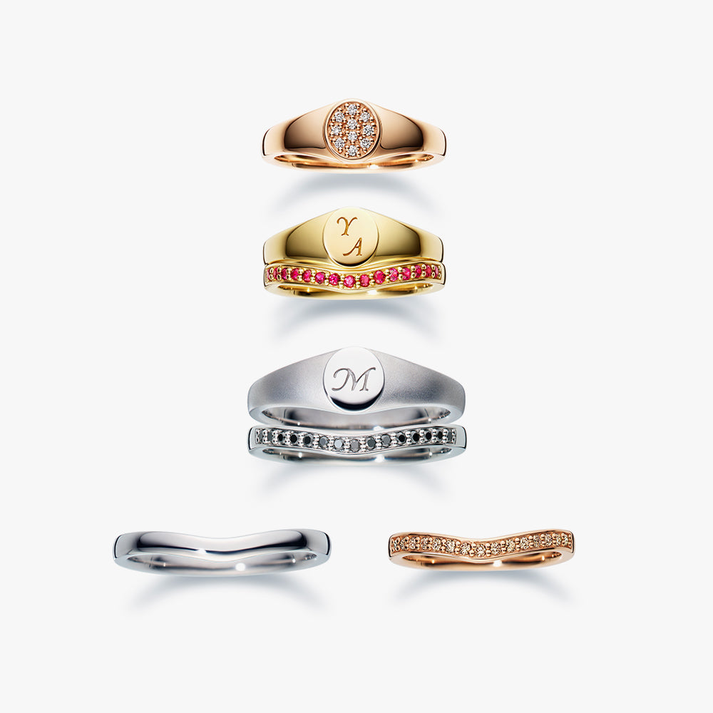 由緒正しい歴史を持つ「シグネットリング」と、相手の愛や指輪を守る意味を持つ「キーパーリング」をベースに、重ね着けも楽しめるデザイン。