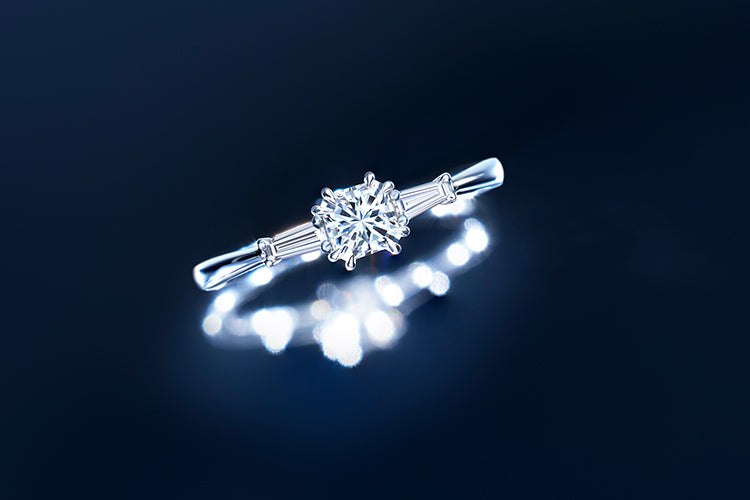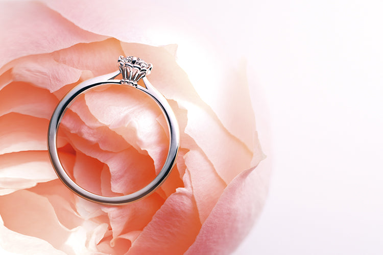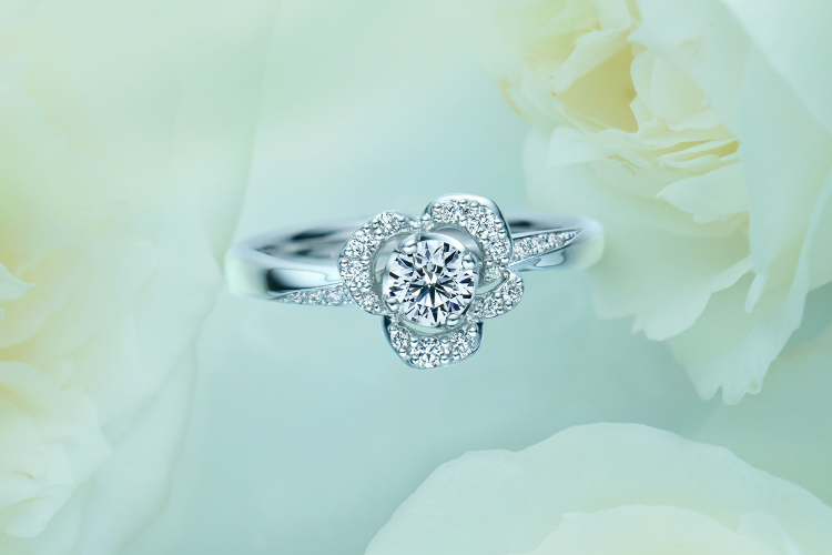 ダイヤモンドの周囲をメレダイヤで包み込んだ、優美で気品あふれるデザイン。強い煌めきと、繊細な輝きのコントラストで普遍的な美しさを表現しました。